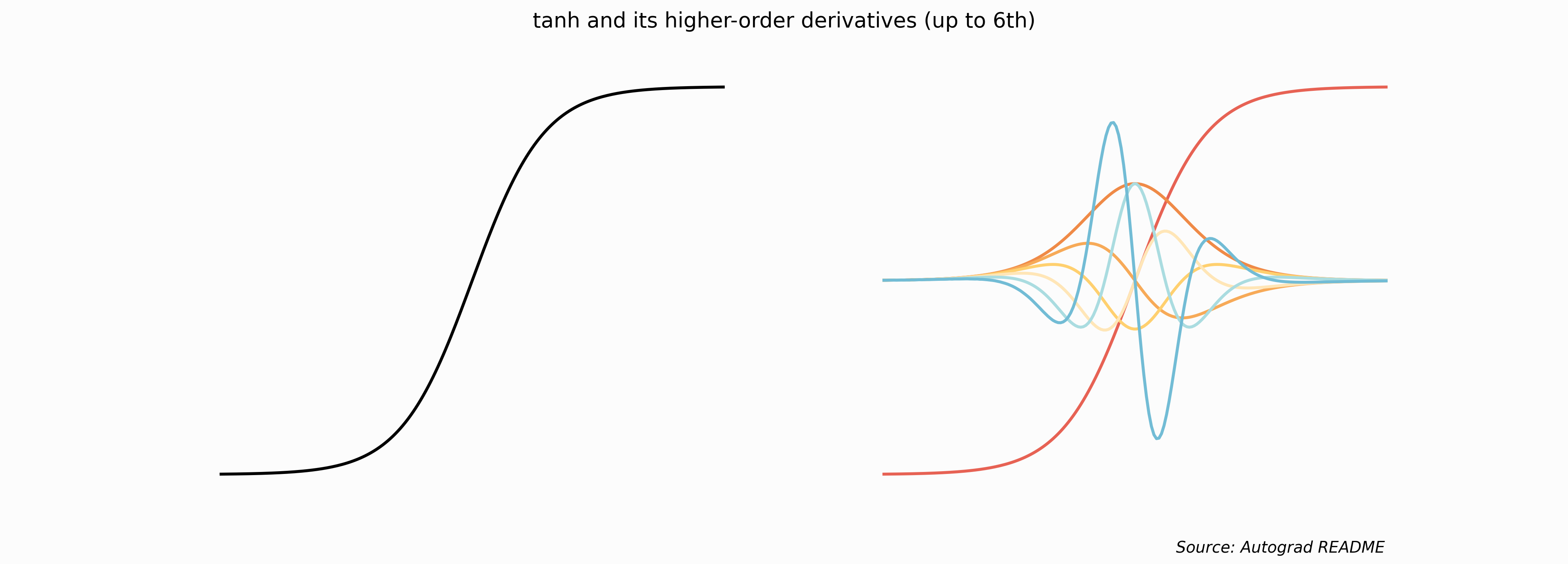 x, vmap(grad(grad(grad(grad(tanh)))))(x), # 4th derivative
